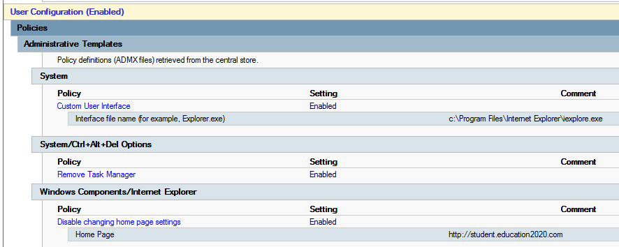 If you haven’t enabled Loopback Policy Processing in any higher GPOs, do so now. Navigate to User Configuration\Policies\Administrative Templates\System. Enable Custom User Interface and type in your application’s file path. For Internet Explorer type: