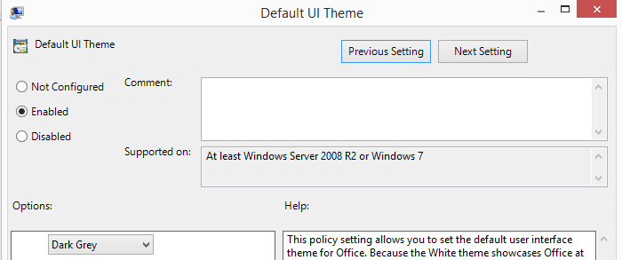 With the updated ADMX settings, you can now edit your Office 2013 GPO. Navigate to User Configuration\Policies\Administrative Templates\Microsoft Office 2013\Global Options\Customize. Enable Default UI Theme and choose your theme. If you don’t see this option, you do not have the updated Office 2013 ADMX templates installed.